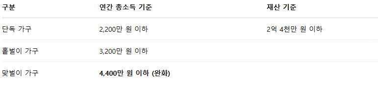 - 작년 총소득이 단독 2,200만 원 / 홑벌이 3,200만 원 / 맞벌이 4,400만 원 이하